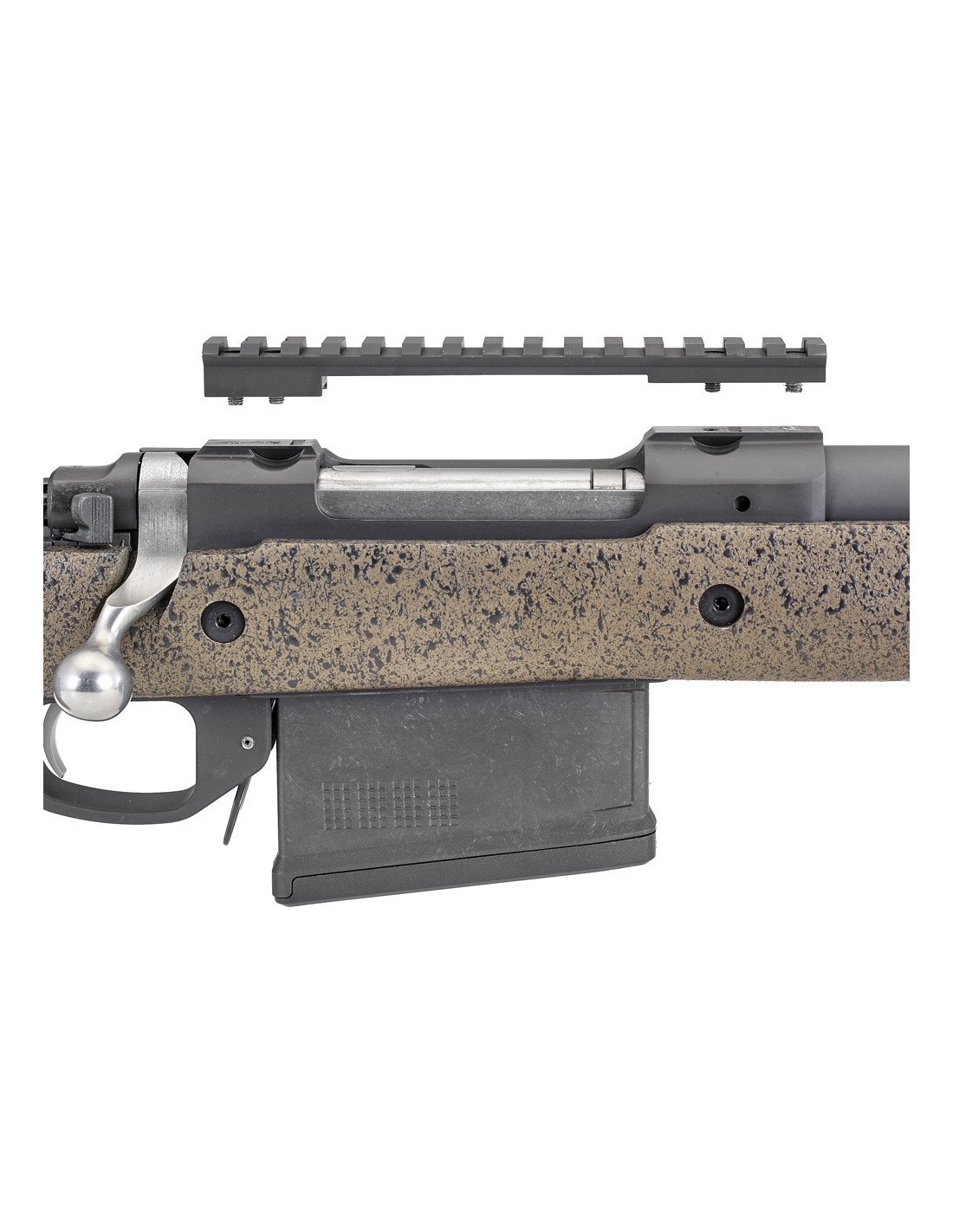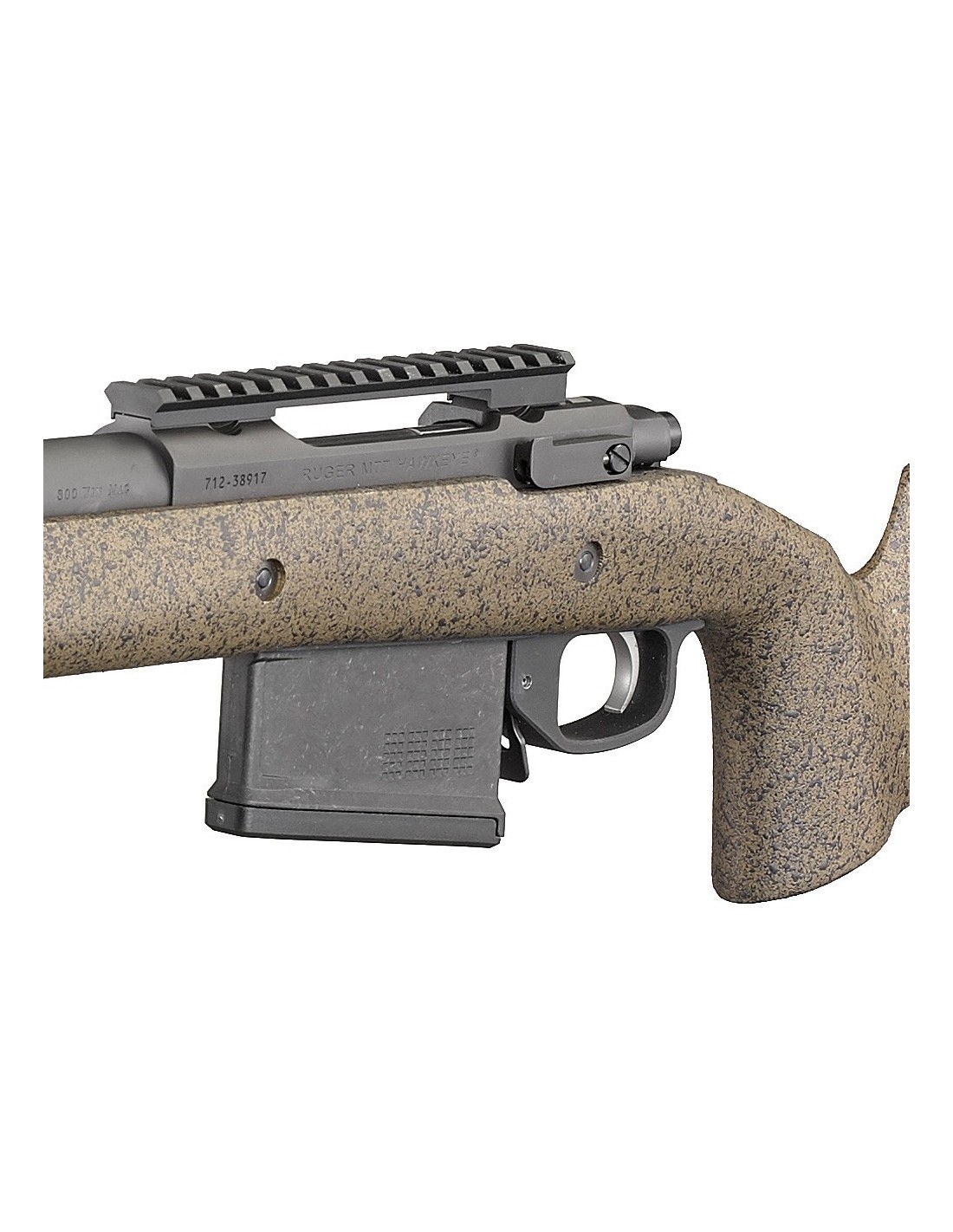 - Carril Picatinny de 20 MOA asegurado con cuatro tornillos 8-40, instalado de serie en el sistema integrado de montaje para monturas patentado por Ruger, mecanizado directamente en la acción de acero inoxidable.