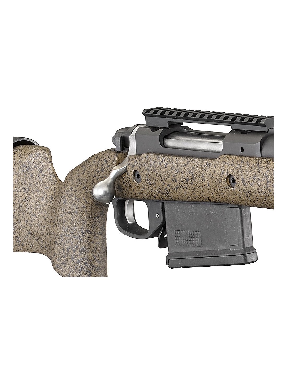 - Carril Picatinny de 20 MOA asegurado con cuatro tornillos 8-40, instalado de serie en el sistema integrado de montaje para monturas patentado por Ruger, mecanizado directamente en la acción de acero inoxidable.