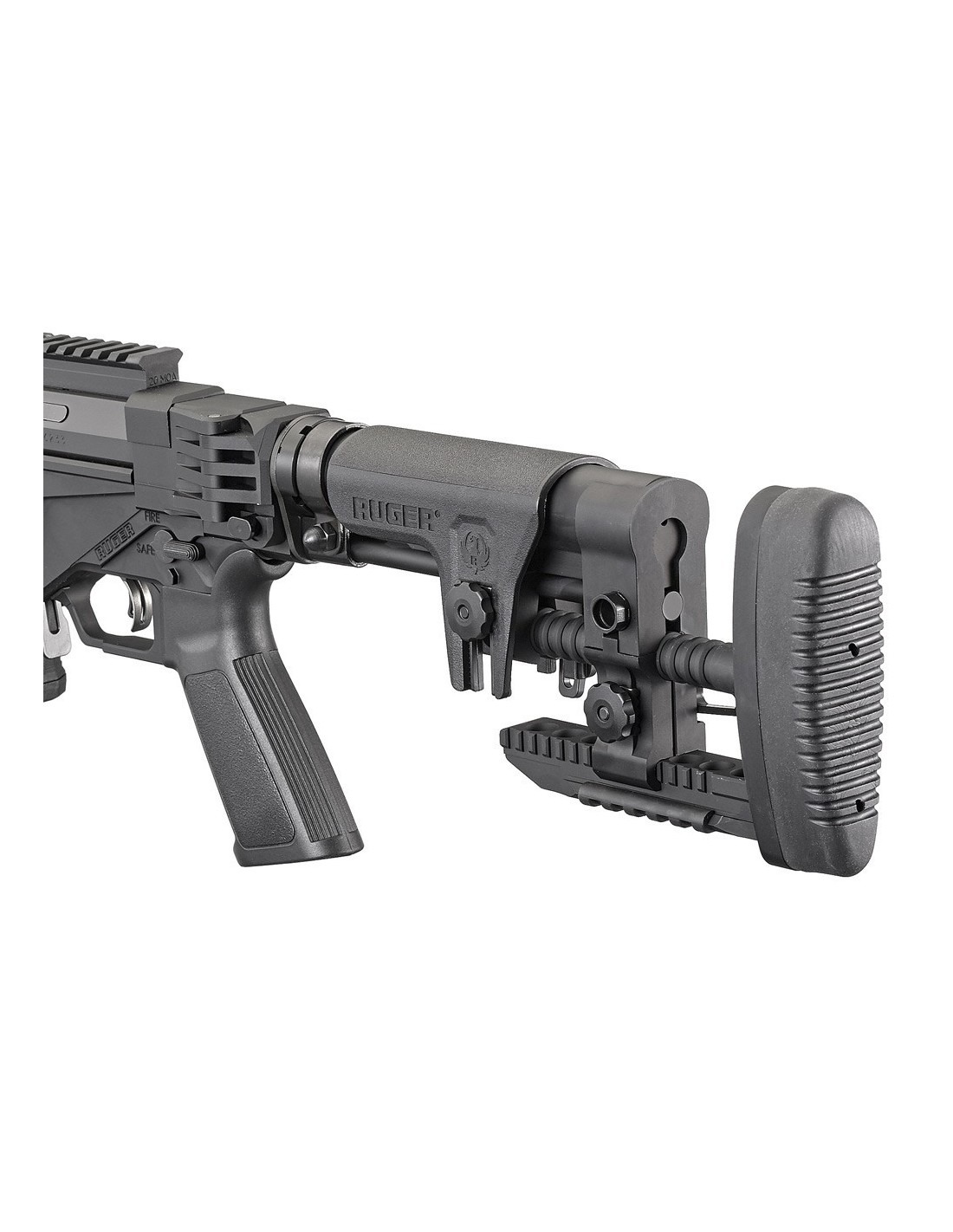 El rifle Ruger Precision incorpora una trayectoria de retroceso en línea directamente desde la parte trasera del armazón hasta la culata, eliminando la necesidad de un sistema de ""chasis"" o encamado tradicional, y proporciona un potencial de precisión máximo al simplificar la respuesta del rifle al retroceso. La culata Ruger Precision MSR es ajustable en longitud y altura, ofreciendo un ajuste adecuado en una amplia gama de tiradores y posiciones de tiro. El ajuste de la longitud y la altura se cambian de forma fácil y precisa, asegurando que no se moverán mientras se dispara. La culata también cuenta con múltiples puntos de sujeción de correas QD, un carril Picatinny inferior para la fijación de apoyos y una cantonera de goma suave. La bisagra de culata plegable a la izquierda (que proporciona acceso al cerrojo) está unida a un tubo amortiguador de estilo AR y acepta culatas de estilo AR.