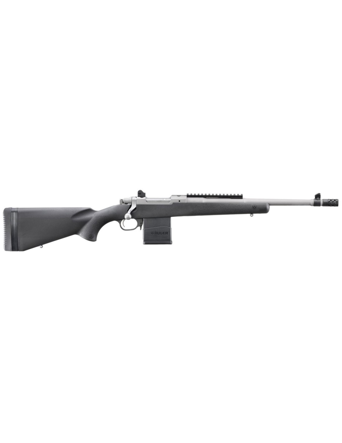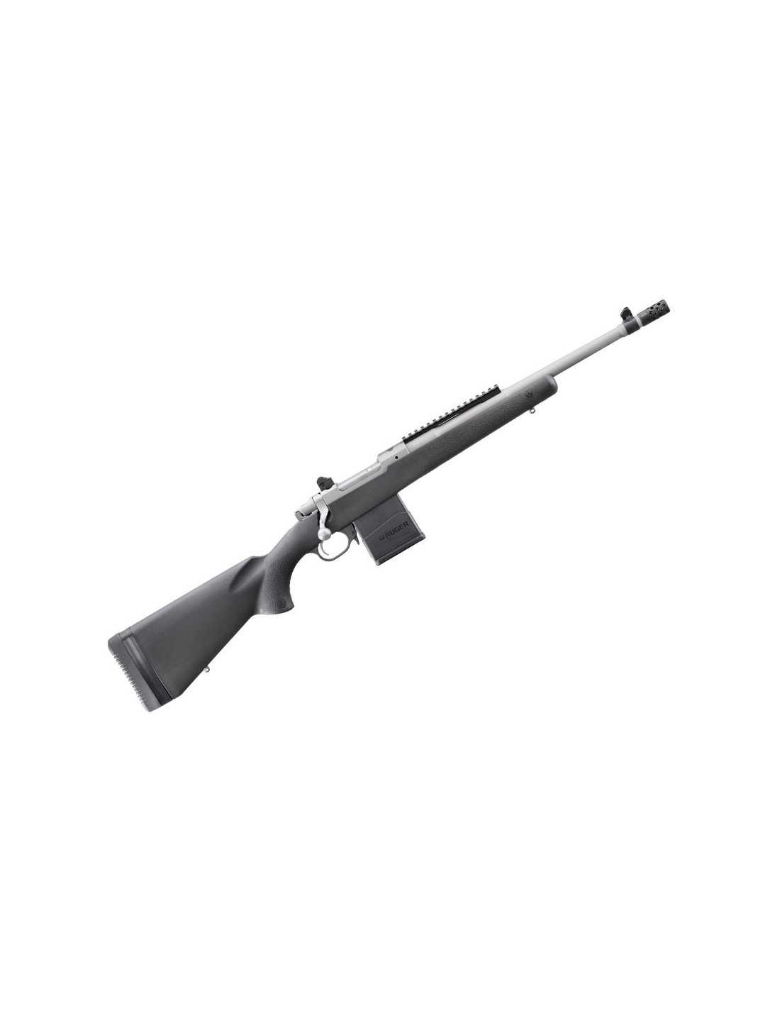 El nuevo Ruger Scout ahora está disponible con una culata sintética composite ligera de color negro. La culata de composite reduce el peso del rifle a tan solo 2,8 Kg., 350 gramos menos que la popular versión con culata de madera laminada. Esta nueva versión cuenta con un bloque de asiento de aluminio delantero y un pilar de aluminio trasero que ubican positivamente la acción y hacen flotar libremente el cañón de tan solo 41 cm. para una precisión excepcional.