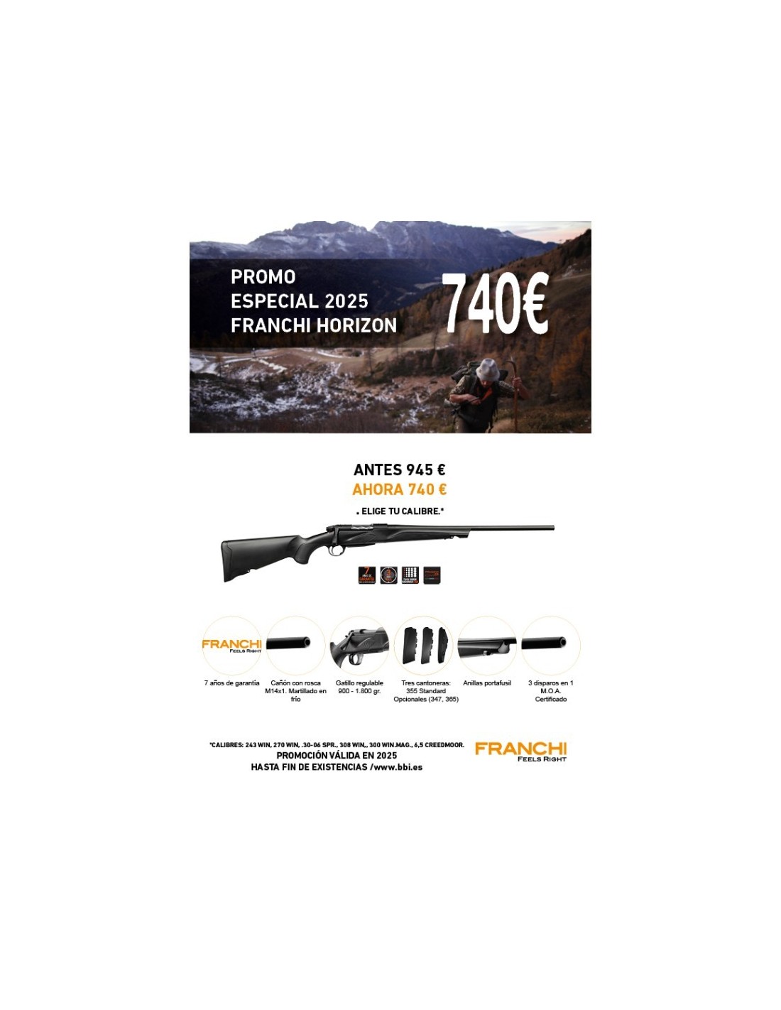 De líneas esenciales, pero inconfundibles, Horizon Black Synt es el primogénito de la familia de los rifles de repetición simple de Franchi, con cargador extraíble de 3 o 4 disparos y obturador fluted. En el origen del nuevo horizonte Franchi, Horizon Black Synt es la versión estándar de todos los bolt action de la familia Horizon. Horizon Black Synt ahora está disponible con cargador extraíble de 3 o 4 disparos según el calibre. Las líneas firmes de Black Synt se destacan por el diseño distintivo del obturador estriado Dependa Bolt con 3 aletas de cierre, que permite una apertura de 60° y permite acceder a la acción del rifle gracias a una maneta cónica aligerada, para un rápido rearme también con tubos ópticos de grandes dimensiones. El obturador fluted tiene una forma particular que, además de hacer que estéticamente sea bonito, permite un rearme fluido incluso con hielo. Ligero y manejable, es ideal para la caza selectiva de los ungulados, tanto en búsqueda como al acecho en la torreta, gracias a la facilidad de encare garantizado por la culata realizada con un diseño exclusivo de Franchi. El guardamanos del arma está preparado en la culata y en el guardamanos para los eslabones de la correa, incluida, y para el montaje del bípode. Disponible en los calibres .223 REM, .243 WIN, .270 WIN, .308 WIN, .30-06 SPRG, 6,5 CREEDMOOR y .300 WIN MAG tiene el grupo de disparo Relia Trigger, ligero y sensible, comprendido entre 0,8 y 1,9 Kg y se puede calibrar con tornillos de regulación. El cañón, realizado por rotomartillado en frío de acero al cromo molibdeno, mantiene la máxima precisión de disparo en disparo. También Horizon Black Synt, como todos los rifles Franchi, tiene el certificado de 1 M.O.A. en tres disparos.