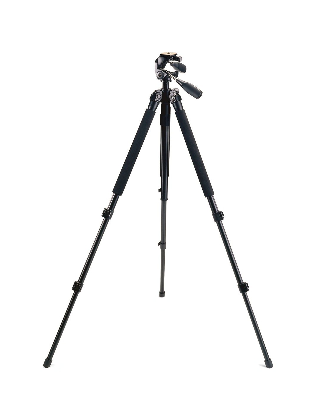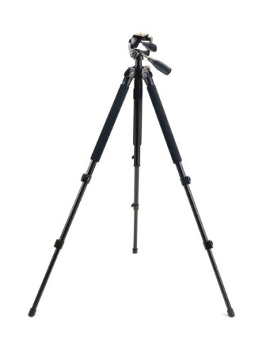 Nuestro modelo de titanio presenta tres posiciones de ajuste del ángulo de apertura de las patas, una cabeza panorámica tridireccional, dos mandos panorámicos y basculantes y una columna central reversible sin engranaje. Lo mejor en trípodes por su calidad Bushnell® y su peso razonable.