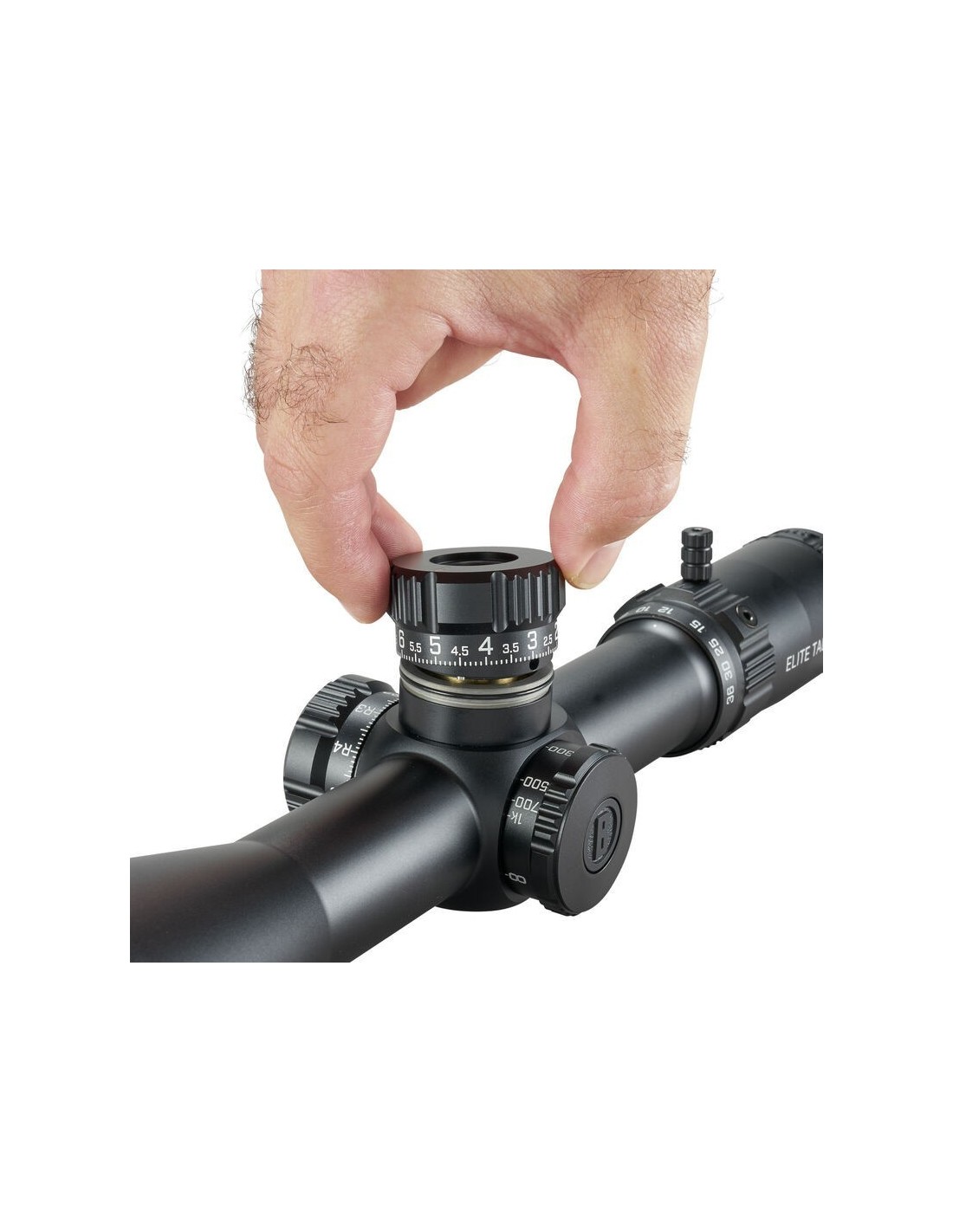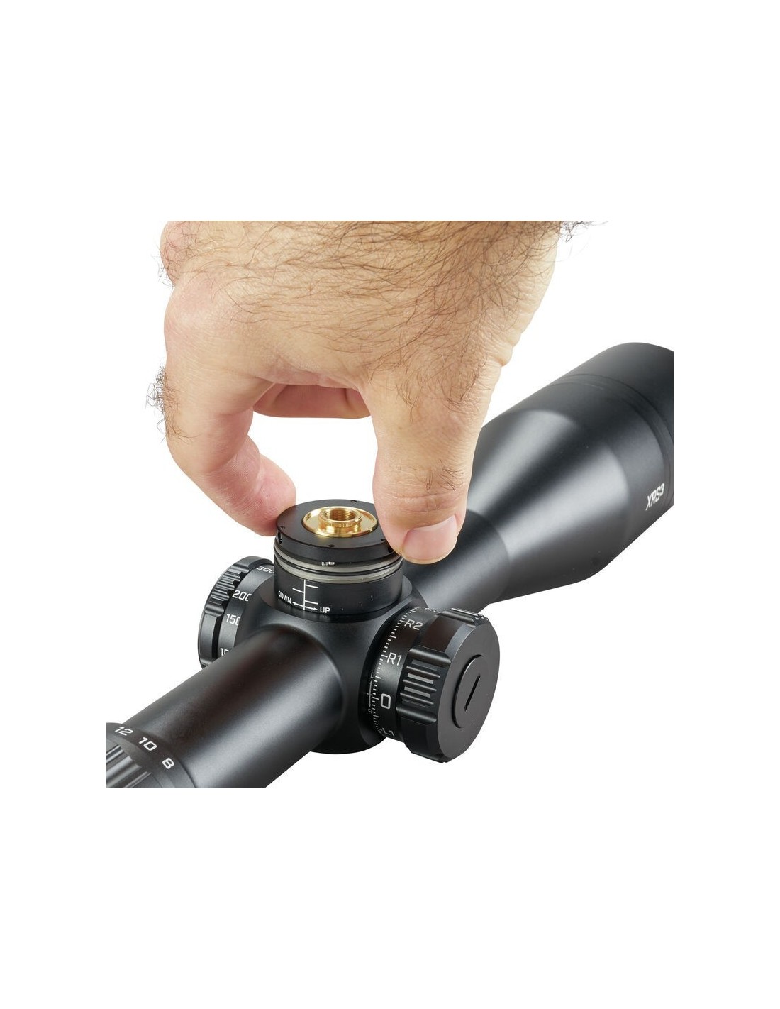 El sistema de torretas es uno de los elementos distintivos de esta óptica tope de gama de BUSHNELL. Las torretas tienen un muy buen tacto, gracias a una dureza justa y una acertada sonoridad. Se mantiene el sistema de seguro T-LOK, solo para la torreta de deriva, que es normalmente la más expuesta a regulaciones accidentales. Este sistema es uno de los más efectivos e intuitivos del mercado, tan simple como tirar del capuchón que cubre el dial de regulación. El paso por click es de 0,1 MIL, que como sabemos a 100 m representan una corrección de 10 mm. La torreta de elevación cuenta sistema RevLimiter™ Zero Stop, que hará que una vez configurado, podamos volver rápidamente al cero definido previamente. La puesta a cero es también realmente sencilla e intuitiva.