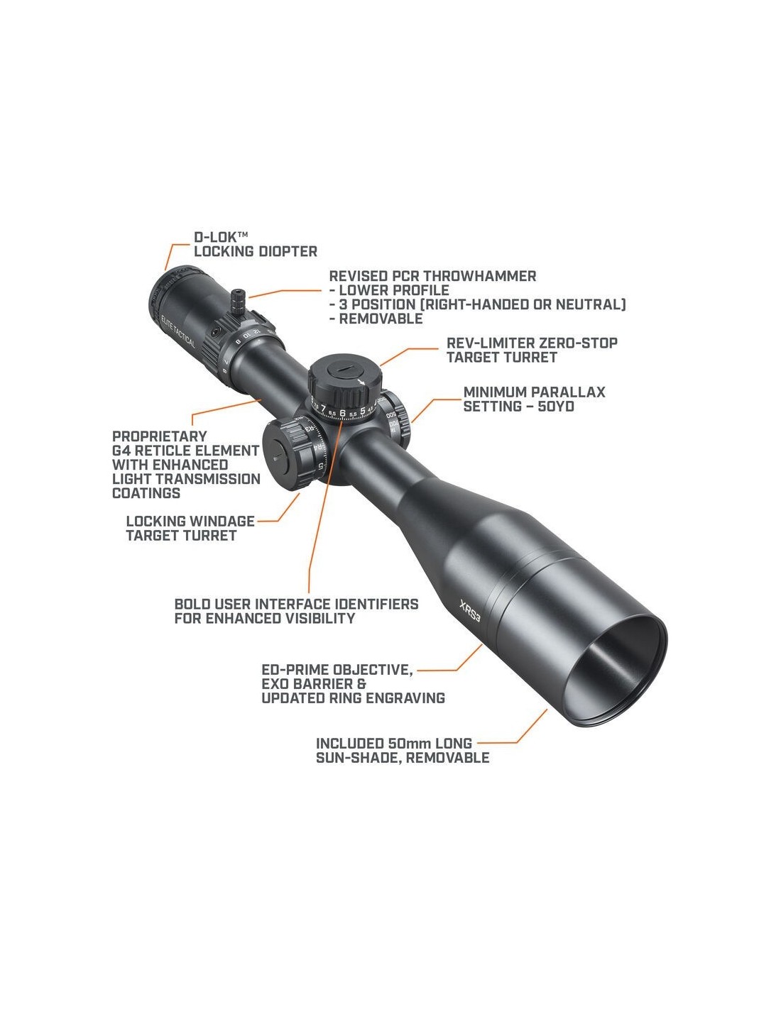 Fabricado en tubo de 34 mm, vine con retícula de precisión G4P, ajuste de paralaje de enfoque lateral, maneta PCR ThrowHammer ajustable o desmontable, bloqueo de la torreta de deriva, y torreta de elevación sin bloqueo con parada en cero RevLimiter™ Zero Stop.