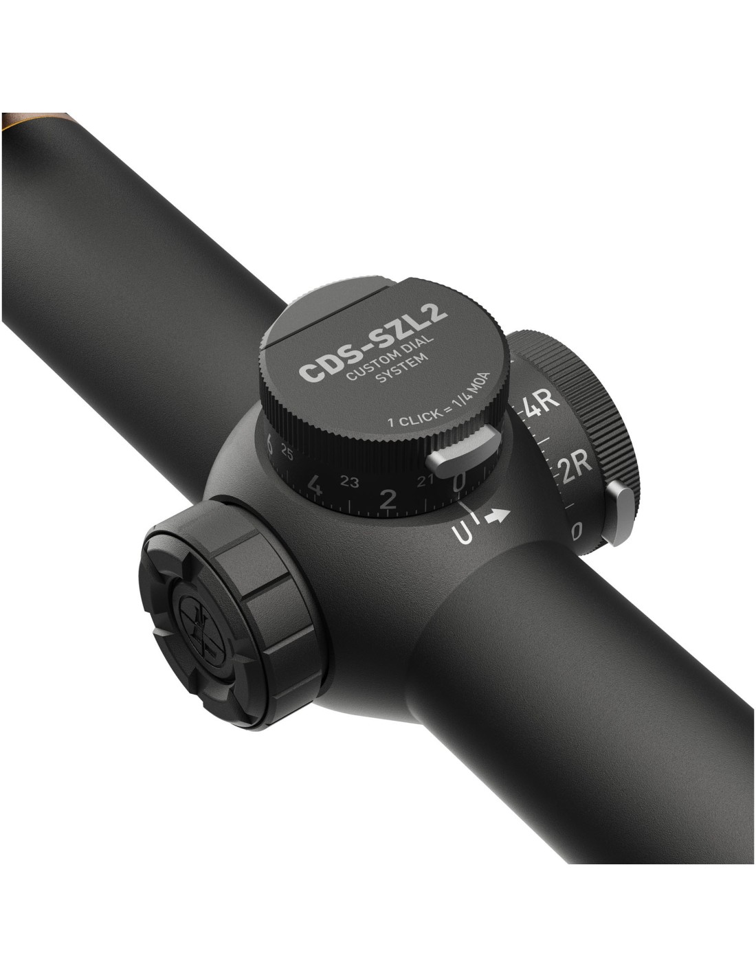 - Torreta de bajo perfil, con un máximo de dos rotaciones completas. El botón de bloqueo permanece a la vista durante la primera vuelta y se esconde durante la segunda. El sistema CDS-SZL2 (Custom Dial System ZeroLock2) para la torreta de altura, se maneja fácilmente para establecer posiciones de forma rápida, basta con presionar el botón de bloqueo a la vez que realizamos el giro. Además, el sistema permite una fácil puesta a cero y por tanto la vuelta a la posición de partida de forma muy rápida.