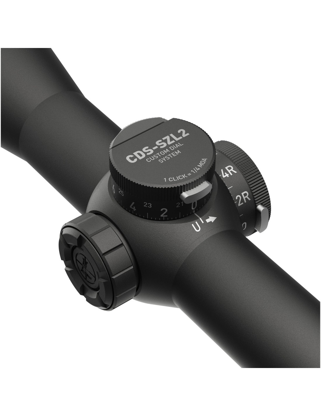 - Torreta de bajo perfil, con un máximo de dos rotaciones completas. El botón de bloqueo permanece a la vista durante la primera vuelta y se esconde durante la segunda. El sistema CDS-SZL2 (Custom Dial System ZeroLock2) para la torreta de altura, se maneja fácilmente para establecer posiciones de forma rápida, basta con presionar el botón de bloqueo a la vez que realizamos el giro. Además, el sistema permite una fácil puesta a cero y por tanto la vuelta a la posición de partida de forma muy rápida.