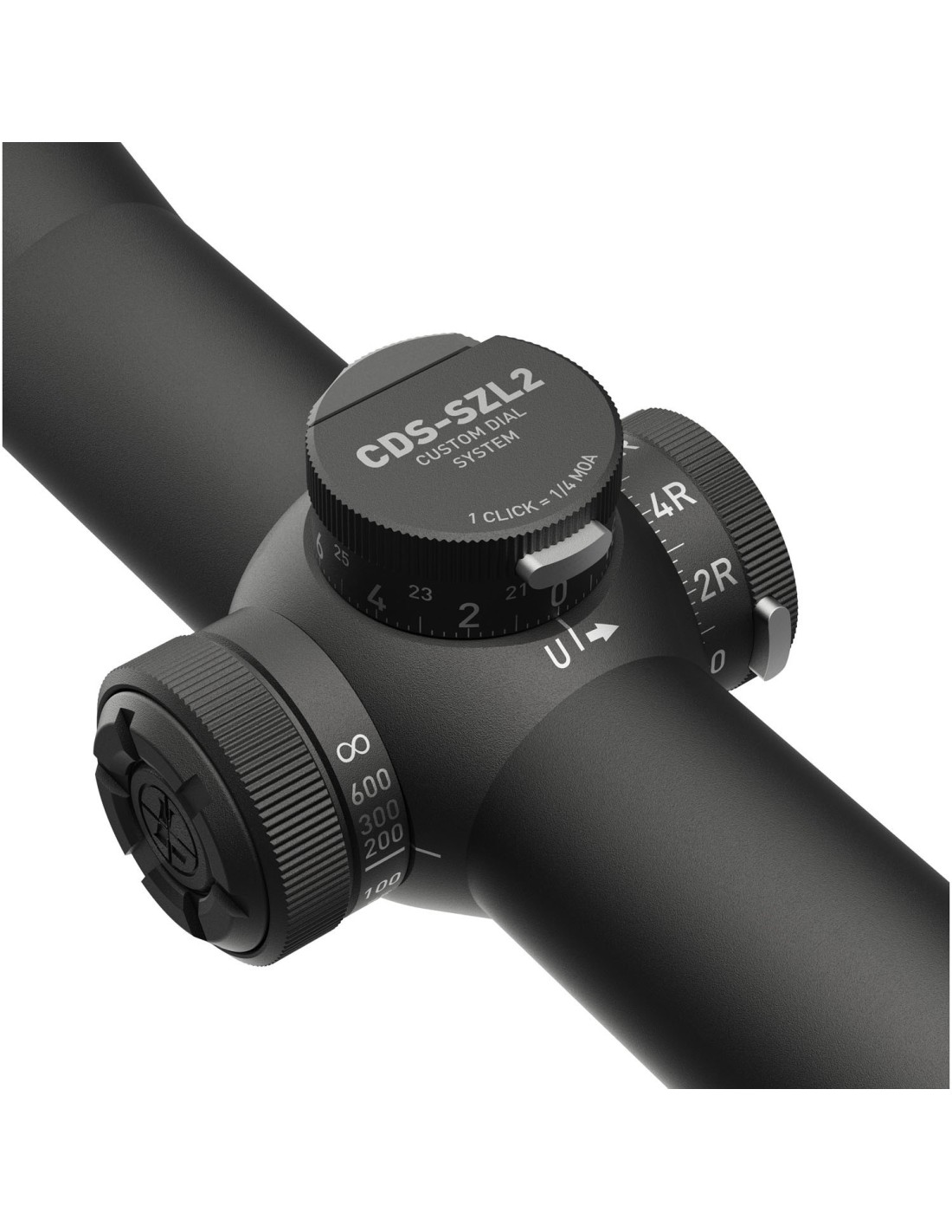 - Torreta de bajo perfil, con un máximo de dos rotaciones completas. El botón de bloqueo permanece a la vista durante la primera vuelta y se esconde durante la segunda. El sistema CDS-SZL2 (Custom Dial System ZeroLock2) para la torreta de altura, se maneja fácilmente para establecer posiciones de forma rápida, basta con presionar el botón de bloqueo a la vez que realizamos el giro. Además, el sistema permite una fácil puesta a cero y por tanto la vuelta a la posición de partida de forma muy rápida.