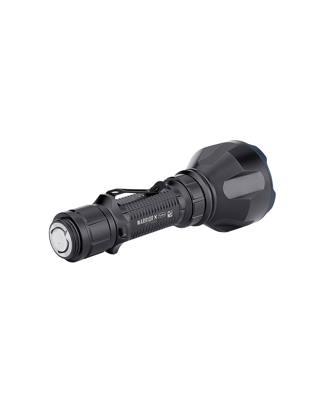 La Olight Warrior X Turbo es la nueva linterna táctica que produce un haz de luz de 1.000 metros de alcance. Con una tamaño compacto, la Warrior X Turbo ofrece una salida máxima de 1.100 lúmenes y ofrece un tiempo de ejecución máximo de 12,5 horas. Este modelo conserva varias características de la serie Warrior X. El interruptor de cola magnético también sirve como puerto de conexión para el cable de carga magnético y el pulsador remoto magnético. Además, la tapa trasera ha sido diseñada para un mejor ajuste del interruptor de presión remoto. Con un gran rendimiento y ricos accesorios, la Warrior X Turbo es una herramienta de iluminación ideal para la caza, búsqueda y rescate, dotación policial y actividades al aire libre.